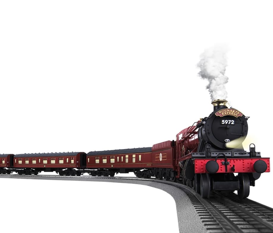 This is the passenger train set that takes young witches, wizards, and even muggles on a magical journey to Hogwarts School of Witchcraft and Wizardry. Manufactured by Lionel, the foremost name in electric toy trains since 1900, this ready-to-run O-gauge train captures the detail of the film’s steam locomotive with puffing smoke, chuffing sounds, and an operating headlight. Operated via remote control or a free smartphone app, the die-cast, battery-powered train bears the official Hogwarts coat of arms on its tender and pulls two passenger cars with interior illumination and a combination car. Set includes eight curved sections, a lock-on section, terminal section, and two 10″ straight sections that form a 40″ x 60″ oval track.