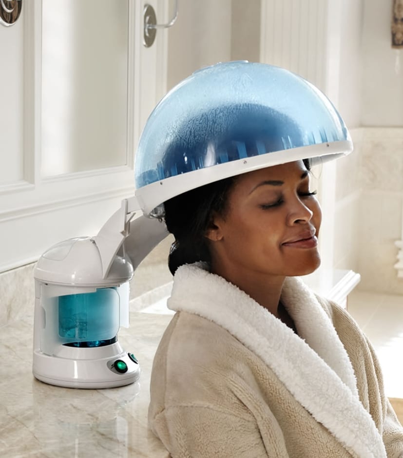 This is the tabletop hair steamer that distributes negatively charged ions to reduce itchiness and dandruff while adding nourishing moisture. Once the bonnet is positioned over the head, the built in-ozone generator begins its release of ions to boost scalp health, while an ultrafine Nano mist moisturizes and hydrates each strand of hair, improving the absorption of conditioners and other treatments.
