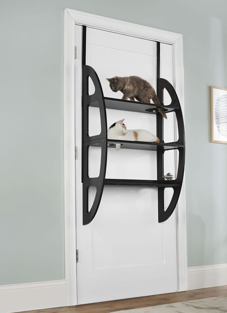 Unlike bulky cat beds that can take up valuable floor space, this over-the-door apparatus provides an out-of-the-way area for felines to rest. Each of its three 27″ W x 13″ D levels is lined with a sisal scratching mat and an entrance/exit hole on the bottom. It hangs from the top of most doors with a pair of metal hooks yet can also be used as a free-standing catwalk with a pair of 20″ L legs. Crafted from durable MDF, it supports up to 60 lbs. (20 lbs. per platform) and has a polished espresso finish.