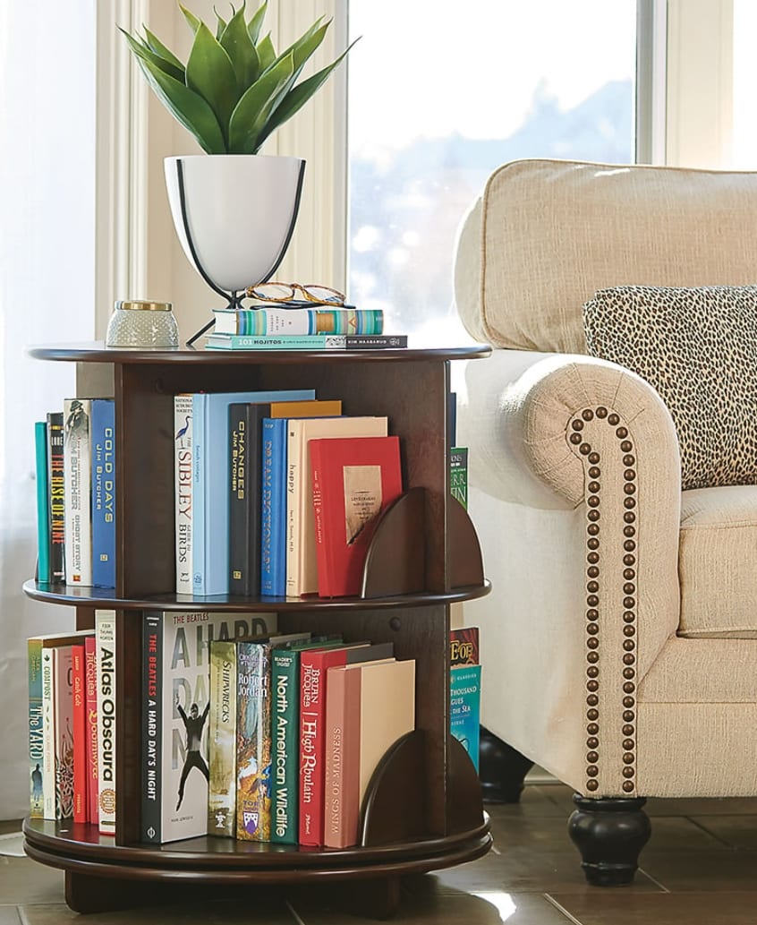 this bi-level bookcase rotates 360º to provide easy access to reading material. A simple turn spins the bookcase so you can browse all of its contents. Capable of holding twice as many books as traditional bookshelves of the same size, the revolving unit has two 11″-tall circular shelves that accommodate paperback novels or unabridged dictionaries. Four separate quadrants on each shelf keep books organized by author or discipline.